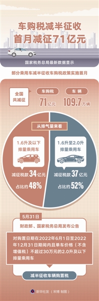 5月下旬,国务院常务会议进一步部署稳经济一揽子措施,提出阶段性减征部分乘用车购置税600亿元。5月31日,财政部、国家税务总局发布公告,对购置日期在2022年6月1日至2022年12月31日期间内且单车价格(不含增值税)不超过30万元的2.0升及以下排量乘用车,减半征收车辆购置税。