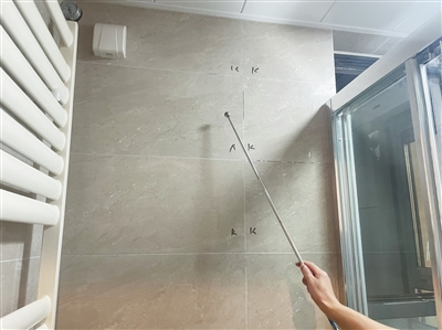 对于普通购房者来说,开发商精装过程中的隐蔽工程很难检查,但这却是资深验房师验房的重点。负责查验空鼓问题的薛工拿着空鼓锤不停地敲击墙面,发现该处精装房卫生间的空鼓问题十分严重。经查验发现,卫生间多处大面积空鼓连成片,基本半面墙砖全部为空鼓,这是本次验房发现最严重的问题之一。薛工一再强调道:“面积超过5%大小的空鼓需要进行维修,由于卫生间内长期潮湿,在这个潮湿的空间里会发生瓷砖脱落情况,瓷砖脱落砸到人的可能性是非常大的,所以需要及时整修,符合做灌浆处理的可灌浆,否则需拆除重新铺贴,业主需要着重监督开发商整改。”