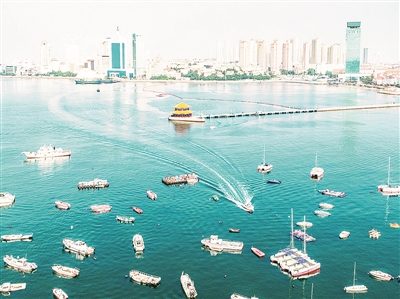 ■夏日的青岛沿海一线人气渐旺,许多游客乘坐快艇出海欣赏美景。快艇踏浪“画”出美妙的弧线,令人心旷神怡。