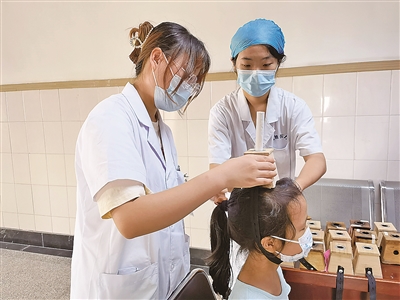 ■随着三伏天的到来,青岛市海慈医疗集团、青岛西海岸新区中医医院等多家医院纷纷启动三伏养生节,根据贴敷人员体质差异,打好冬病夏治“组合拳”。图为海慈医疗集团儿科特色疗法“天灸”。