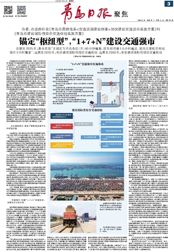 市委、市政府印发《青岛市贯彻落实<交通强国建设纲要>加快建设交通强市实施方案》和《青岛市建设国际性综合交通枢纽实施方案》~~~近期至2025年,基本实现“主城区与市内各区(市)40分钟通勤、胶东经济圈1.5小时通达、国内主要航空枢纽城市3小时覆盖”;远期至2035年,初步建成国际性综合交通枢纽;远景至2050年,全面建成国际性综合交通枢纽