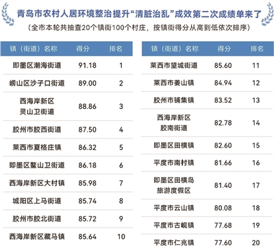 此次七个涉农区市农村人居环境“清脏治乱”成效从高到低排名为:崂山区、西海岸新区、城阳区、莱西市、胶州市、即墨区、平度市。此外,本轮还抽查了全市20个镇街100个村庄,并发布排名情况。