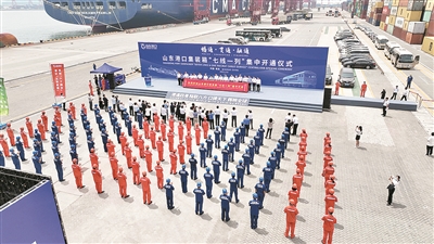 本报8月8日讯 同日开通“七线一列”,再度彰显山东港口青岛港的航运枢纽竞争力。今天,山东港口在前湾港区举行集装箱“七线一列”集中开通仪式,以海向陆向双向发力的实际行动,强力保障全球产业链供应链畅通稳定。