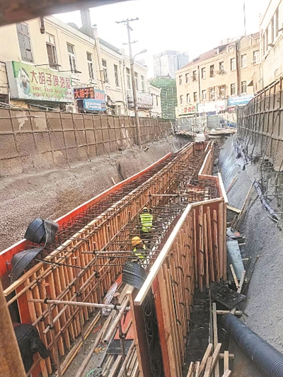 “黄岛路地下的管线,要么物探图没有记录,要么有记录也存在不全、不完善之处。对于现场施工新发现的管线,我们需要先保护它,然后再施工地下管廊和相邻市政管线。地上部分,因为电力迁改还没有完成,现存的变压器、电线杆,让现场施工存在很大的危险性,需要做好周全的安全防护措施。同时,在市政管线施工过程中,为了保障周边居民和商户正常的生产、生活,我们还需要敷设临时供水、排水、燃气管道设施。这些综合因素,让施工难度呈几何级数增长。”项目设计负责人蔡宝华告诉记者。