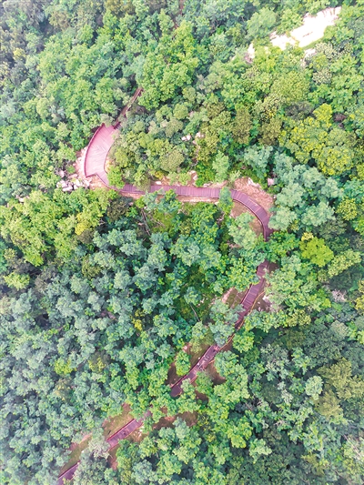 在太平山上,一条沿山势绵延向上的登高观景线掩映在繁茂的植被当中。这条全长1.2公里的棕色木栈道北起植物园西北门,南接植物园花道,行走其中,令人心旷神怡,如在画中游。
