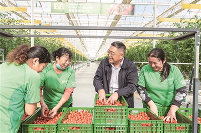 如今,七星河新村的西红柿产业形成了“合作社+龙头企业+农户”模式,三者各展其长,形成了竞争合作、优势互补的发展格局。龙头企业不仅是新型农业经营主体中的“精锐部队”,也是加快转变农业发展方式、推进农业绿色发展的“开路先锋”。位于七星河新村的中建材智慧农业产业园是全国最大的无土栽培种植基地,总投资50亿元,占地1200亩。在智能玻璃温室,处处彰显着智慧的元素,整个玻璃温室分布着846个传感器、2330个控制器,这些硬件实时记录植株从定植到采收的全过程,每天产生2000余万条数据记录,让农业也学会了“思考”。