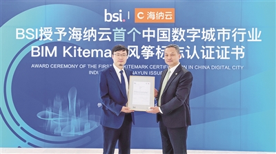 本报8月31日讯 BSI(英国标准协会)今天在青岛举行授牌仪式。海纳云物联科技有限公司(以下简称“海纳云”)通过BSI的严格审核,获得BSI BIM Kitemark风筝标志认证,成为数字城市行业率先获得该认证的中国企业。
