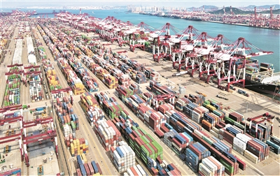 国庆假期,山东港口青岛港迎来生产高峰,码头泊位上停满了装卸的船舶,桥吊一字排列有序装卸,运输车辆川流不息,一派繁忙景象。前湾港区大船频靠,8000TEU以上大型船舶接踵而至,在“美德马士基”作业中,桥吊平均单机效率达32.4自然箱/小时,提前1.3小时完船。