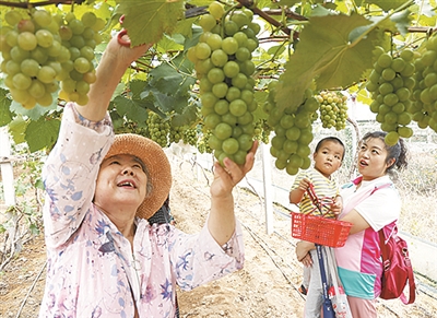 在大村镇阳光玫瑰葡萄示范基地内,颗粒饱满的葡萄挂满枝头,前来采摘的游客络绎不绝,他们拿着剪刀穿梭于一行行葡萄藤蔓间,精心挑选后小心翼翼剪下,畅享田园采摘的乐趣。“今天带着孩子、老人一同来感受秋天的魅力。