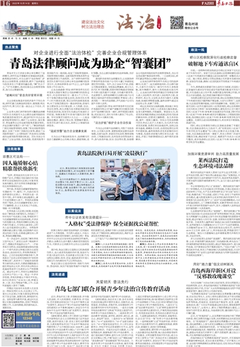 青岛市有2万多家企事业单位聘任了法律顾问,律师们运用掌握相关领域法律法规、政策规定的特长,对企业进行“法治体检”,护航企业合规管理、合规经营,提升了法律意见与服务单位工作需求的融合度,“顾”到点子上,“问”在关键处,推动完善企业合规管理体系,助力企业健康发展。