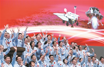 ■2021年5月15日7时18分,天问一号着陆巡视器成功着陆于火星乌托邦平原南部预选着陆区,我国首次火星探测任务着陆火星成功。这是航天科研人员在北京航天飞行控制中心指挥大厅庆祝。 新华社照片