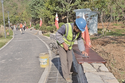 记者看到,新修建的木栈道中,有两处是“架空”栈道。施工现场负责人黄广路解释说,建造两处架空栈道,主要是因为周边的道路是消防通道,坡度较大,修建架空栈道有利于实现人车分流。而木栈道将坡度设置在6%以下,让居民在登山过程中更加舒适。“另外一处木栈道通往景观节点,人流量较大,所以我们将其打造成4.2米宽,便于市民上下山。”此外,新建绿道中,采用菠萝格木地板铺装1155米,沿线砌筑景观挡墙和石笼坐凳。“木地板都是防腐的,木材硬度高,不易腐烂。景观挡墙既有虎皮挡墙,也有石笼挡墙,增加了景观的多样性。”黄广路说。