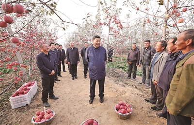 车间外,老乡们聚集在一起,高声向总书记问好。习近平同老乡们拉起家常,回忆当年他在陕北的知青岁月。习近平对老乡们说,我在陕北生活了7年,当年看到老乡们生活很艰苦,心里就想着怎么样让大家生活好起来。这次来延安,看到一派硕果累累的丰收景象,交通条件大为改善,发生了翻天覆地的变化。过去陕北老乡们修梯田、种庄稼,面朝黄土背朝天,抡起老锄头干活,广种薄收,十分辛苦,如今山坡上退耕还林种上了苹果,老乡们有工作、有稳定收入,孩子有好的教育,老人都有医保,生活越来越好。从陕北的变化就可以看到中国的变化。习近平指出,现在,“两个一百年”奋斗目标的第一个百年目标已经实现,绝对贫困问题解决了,老乡们过上了好日子,但还要继续努力往前走,让生活越来越美好。陕北的气候、光照、纬度、海拔等非常适宜发展苹果种植,加上滴灌技术、矮化种植技术、选果生产线等不断发展,就地卖出,销路不愁,大力发展苹果种植业可谓天时地利人和,这是最好的、最合适的产业,大有前途。习近平强调,中国共产党是人民的党,是为人民服务的党,共产党当家就是要为老百姓办事,把老百姓的事情办好。空谈误国,实干兴邦。要认真学习贯彻党的二十大精神,全面推进乡村振兴,把富民政策一项一项落实好,加快推进农业农村现代化,让老乡们生活越来越红火。老乡们爆发出雷鸣般的掌声。