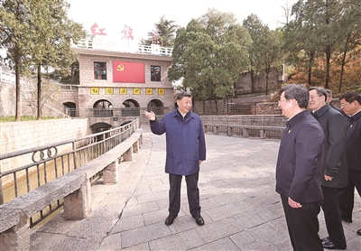 28日上午,习近平来到河南安阳林州市红旗渠纪念馆。上世纪60年代,当地人民为解决靠天等雨的恶劣生存环境,在党和政府支持下,在太行山腰修建了引漳入林水利工程,被称为“人工天河”。习近平走进展馆,依次参观了“千年旱魔,世代抗争”、“红旗引领,创造奇迹”、“英雄人民,太行丰碑”、“山河巨变,实现梦想”、“继往开来,精神永恒”等展览内容。习近平指出,红旗渠就是纪念碑,记载了林县人不认命、不服输、敢于战天斗地的英雄气概。要用红旗渠精神教育人民特别是广大青少年,社会主义是拼出来、干出来、拿命换来的,不仅过去如此,新时代也是如此。没有老一辈人拼命地干,没有他们付出的鲜血乃至生命,就没有今天的幸福生活,我们要永远铭记他们。今天,物质生活大为改善,但愚公移山、艰苦奋斗的精神不能变。红旗渠很有教育意义,大家都应该来看看。随后,习近平实地察看红旗渠分水闸运行情况,详细了解分水闸在调水、灌溉、改善生态环境等方面的重要作用。