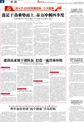 党的二十大是在全党全国各族人民迈上全面建设社会主义现代化国家新征程、向第二个百年奋斗目标进军的关键时刻召开的一次十分重要的大会。新征程上,将党的二十大擘画的宏伟蓝图变为现实,需要付诸行动、见之于成效。时间进入11月份,冲刺四季度、努力实现全年经济社会发展目标任务的责任感、使命感和紧迫感催人奋进。各区市正以“事争一流、唯旗是夺”的志气,坚定信心、埋头苦干,紧跟市委三条工作主线,不断开创青岛各项事业发展新局面。号角激越,催人奋进。擂台上,各区(市)党委书记纷纷表示,将以党的二十大精神为指引,把发展作为第一要务,坚定信心、鼓足干劲,担当作为、真抓实干,努力实现全年目标任务,不断开创高质量发展新局面,为青岛在全省勇当龙头、在全国争先进位、在全球彰显特色贡献力量。