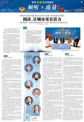 11月29日上午,由市政协委员联络活动工作室、市12345政务服务便民热线、青岛日报社共同打造的“倾听与商量”协商平台第20期协商活动举行。本期协商活动邀请政协委员、专家学者和相关职能部门负责人围绕“阅读,让城市更有活力”主题展开讨论。在倾听中交流思想,凝聚共识;在商量中汇集力量,解决问题。