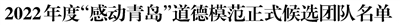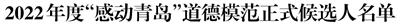 为深入学习贯彻习近平新时代中国特色社会主义思想,大力培育和践行社会主义核心价值观,着力培养时代新人、弘扬时代新风,在全社会推动形成崇德向善、见贤思齐、德行天下的浓厚氛围,根据市文明委年度工作安排,市委宣传部、市总工会、团市委、市妇联组织开展2022年度“感动青岛”道德模范评选表彰活动。经活动组委会组织资格审查、事迹审核、评委会评审,确定了由各区(市)、各部门(单位)推荐的35名正式候选人(含3个团队、排名不分先后)参加评选。现将正式候选人进行公示。