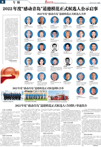 12月8日,35名正式候选人(含3个团队)名单、照片及事迹简介在青岛日报、青岛市广播电视台、青岛早报、青岛晚报、半岛都市报、观海新闻客户端、青岛新闻网、青岛文明网、蓝睛客户端、爱青岛客户端进行集中宣传公示,接受社会监督。公示时间为2022年12月8日8:00至12月14日24:00。