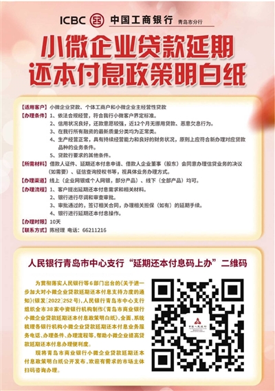 受疫情反复影响,部分小微企业经营发展暂时遇困和面临资金难题,甚至陷入困境。青岛工行严格落实党中央、政府、监管机构关于支持小微企业和个体工商户纾困发展的工作要求,积极满足企业延期还本付息需求,按市场化原则和客户意愿为小微企业(含小微企业主、个体工商户、货车司机等)提供延期还本付息服务,对未来仍有长期发展潜力、有还款意愿、能够支持就业的小微企业,努力做到应延尽延,不盲目限贷、抽贷、断贷,不单独因疫情因素下调贷款风险分类,不影响客户征信记录,高效帮助小微企业渡过难关。一是安排专人提前摸排受疫情影响的小微企业的经营情况和还本付息意愿,对已办理延期还本付息的普惠小微客户进行跟踪监测,制定合理的管控预案。二是优化贷款期限,加强连续用款支持。对各类小微企业周转类贷款产品,均支持“随借随还”,均支持办理续贷。三是广开获客渠道,利用“工行普惠”小程序登记客户金融服务需求,提供专属服务,支持在线测额、贷款申请、线上股东会等功能,满足小微客户的多样化金融需求。四是扩大政策宣传覆盖面,制作《小微企业贷款延期还本付息政策明白纸》,利用线上线下多渠道推广宣传,通过向网点的电子屏幕、挂墙海报、ATM机和行外的公众号、朋友圈、广播和各类媒体投放支持政策,为小微企业、个体工商户解读政策、推介产品。今年前10个月,青岛工行通过中长期贷款、展期、续贷、再融资、调整计息周期、设置还款宽限期等方式为近千户小微企业提供纾困支持,有效解决小微企业融资接续的难题。