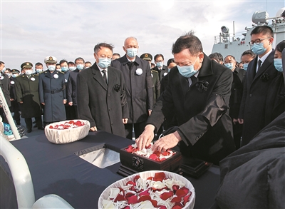 十二月十一日,遵照江泽民同志及其亲属的意愿,敬爱的江泽民同志的骨灰在长江入海口撒入大海。受党中央委托,中共中央政治局常委、中央书记处书记蔡奇等领导同志和江泽民同志的夫人王冶坪等亲属护送骨灰撒放。 新华社照片