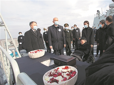 中国人民解放军海军扬州舰伏波静卧,舰上官兵分区列队、肃立舷边。扬州是江泽民同志的故乡。今天,这艘以扬州命名的军舰,以最高礼仪送别这位为党和人民建立了不朽功勋的卓越领导人。江泽民同志的亲属捧护着骨灰登上扬州舰。海军笛吹响,仪仗队持枪肃立,行注目礼。当扬州舰起航时,军港内所有舰船汽笛长鸣,响彻云霄。