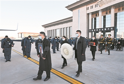 灵车缓缓驶入西郊机场。松柏静立,远山静默。空军官兵列队脱帽,目送载护江泽民同志骨灰的专机起飞。专机盘旋着,在首都北京上空缓缓绕飞一周,告别这一江泽民同志为党和国家事业倾尽心血的地方。
