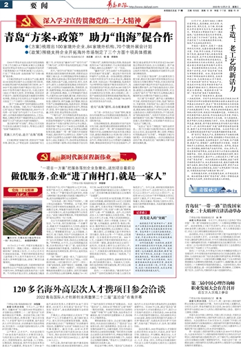 一揽子“方案+政策”支持和鼓励企业抓机遇、抢订单、促招商。目前,有五个批次商务团已经“走出去”接续开展招商洽谈,2023年1月的第一场“出海”合作也将于1月10日开启。届时,由市商务局组织的涵盖纺织品、工艺品、物流、生物技术等多个领域的青岛企业将共同组成“百人团”包机赴日本进行招商推介。