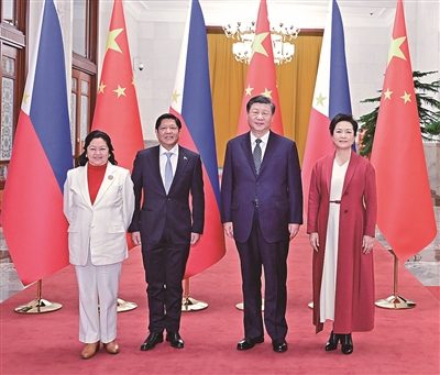 习近平欢迎马科斯就任菲律宾总统后首次访华。习近平指出,这是你首次正式访问东盟以外国家,你也是今年中方接待的首位外国领导人。这充分体现了中菲关系的密切程度,也说明双方在彼此外交格局中占有重要位置。中菲是一衣带水的近邻。在两国上千年交往史上,以诚相待、守望相助始终是中菲关系主流,也是两国人民共有的宝贵精神财富。48年前,你的父亲同中国老一辈领导人洞察时局、顺应大势,共同作出中菲建交的历史性决定。此后近半个世纪,无论国际风云和菲律宾国内政局如何变化,你和你的家族一本初衷,矢志推动中菲友好,这份情谊弥足珍贵。希望你这次访华不仅是一次“怀旧之旅”,更是一次“开创之旅”。中方始终把菲律宾放在周边外交优先方向,坚持从战略和全局高度看待中菲关系。我愿同你保持经常性战略沟通,全面规划双边关系下步发展,做互帮互助的好邻居、相知相近的好亲戚、合作共赢的好伙伴,为两国人民带来更多福祉,为地区和平稳定贡献更多正能量。