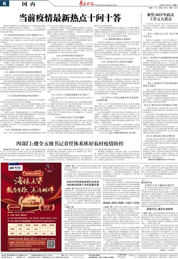国务院联防联控机制、中央农村工作领导小组近日印发《加强当前农村地区新型冠状病毒感染疫情防控工作方案》,要求各地重点抓好农村地区防疫体系运转、药品供应、重症治疗、老人儿童防护等方面工作,加强日常健康服务,突出重点人群管理,有序疏导诊疗需求,提供分级分类医疗卫生服务,最大程度保护农村居民生命安全和身体健康。