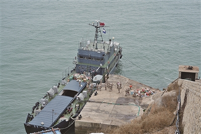 船上载的是市委、市政府送来的慰问品和年货,对于战士们来说,“来船”是像过年一样高兴的事。货物被从船上卸下来,通过缆车运上山。“没有缆车时,这些物资都是岛上官兵们肩扛手提运上山的。”指导员南建阳说。“前不久,青岛市退役军人事务局又给岛上送了一部新的运货装置,不日就会安装投用。”