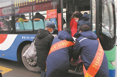 温暖,在一个个志愿服务的背影上跳跃。街道的志愿团队为老人打扫卫生、换洗床单、免费查体;团区委在长途汽车站设立“暖心陪伴餐”自取点,免费向返乡旅客提供热姜茶、防疫物资、泡面餐食;交运温馨巴士“馨飞扬”志愿者在公交站点,帮助市民搬运购置的年货。