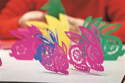 “这幅作品名字叫《大展宏兔》,采用传统的左右对称构图形式和阳剪技法,画面中间的玉兔夫妻簇拥着一株硕大的白菜,谐音‘百财’,花枝上悬挂着代表万事如意的中国结,花朵间是象征美好爱情的蝴蝶。两只玉兔喜笑颜开,头插红花,手持‘国泰民安’条幅,向人们送上新年的祝福。玉兔中间是钱串、元宝和蝙蝠,象征财源滚滚、家庭幸福。下方盛开的牡丹花寓意富贵吉祥、前程似锦。”兔年将近,作为崂山区新时代文明实践家庭站的代表,崂山剪纸非遗文化传人、新时代文明实践志愿者苏霞用“纸上传情”的方式,创作了“双兔送福”“玉兔迎春”“奔跑的兔子”等众多迎春作品,表达新年祝福。此外,她还开设剪纸小课堂,将崂山剪纸这门传统技艺传承给更多孩子。