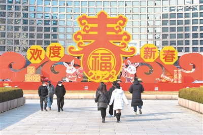 重要道路节点的新春造型景观也陆续亮相。五四广场前,极具传统特色的大型景观造型“迎春送福”格外醒目,高大立体的“春”字造型,搭配了祥云、玉兔图案,寓意着人们对未来的美好向往。