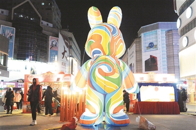 随着人气渐旺,商家店铺也纷纷行动起来,利用广场堆头、楼宇招牌营造新春氛围。台东商圈、李村商圈、东部商圈……店面门头都装扮得喜气洋洋,提着年货的人们不时停下脚步,与造型各异的生肖兔玩偶合影留念。