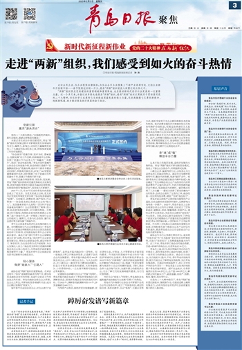 “两新”组织既是党的建设的重要领域和重要阵地,也是推动新时代经济社会发展的一支重要力量。近一个多月来,本报记者多路走进青岛“两新”组织,感受“两新”组织以真抓实干贯彻落实党的二十大精神,切实把学习成果转化为助推高质量发展的强大力量,近距离触摸它们勇担新使命、抢抓新机遇,助力推动青岛经济发展的奋斗脉动。