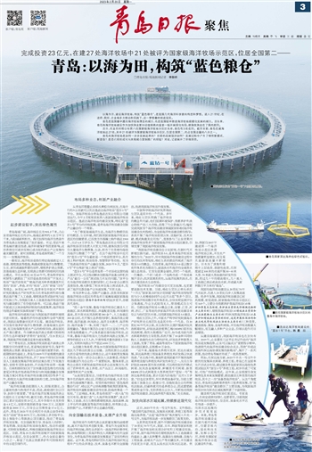 “海洋牧场建设前期投入大、回报周期长,企业最初的参与热情并不高,因此,政府适时加以引导、扶持非常重要。”青岛市海洋发展局海洋渔业处副处长王亚楠介绍,截至目前,青岛海洋牧场建设已累计完成投资23亿元,其中争取中央支持资金4.5亿元,安排市级财政资金7200万元、区级财政资金2000万元,引导企业自筹资金17.6亿元。此外,青岛在2021年充分利用中央渔业油价补贴地方“退坡”资金8075万元,推动海上多功能平台、陆上体验中心等新渔业项目建设,推动了青岛海洋牧场发展。在加强政策引导、资金投入的同时,青岛明确、突出海洋牧场绿色属性,推动形成健康、可持续发展模式,积极创建国家级海洋牧场示范区。目前,青岛21处海洋牧场被评为国家级海洋牧场示范区,位居全国第二,约占全国总量的八分之一,彰显了在渔业资源养护和可持续利用中的示范引领作用。
