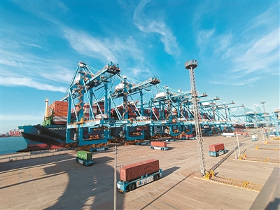 2月19日,来自RCEP(《区域全面经济伙伴关系协定》)航线的“东方比利时”货轮稳稳停靠在山东港口青岛港前湾港区105泊位。卸货结束,货轮旁集装箱卡车往来如织,一边将进口货物送至青岛海关查验平台,接受海关信息核对、机检图像检查等监管,一边装载出口货物……港口是经济发展的“晴雨表”,一艘艘货轮频繁造访青岛港,折射出外贸经济的发展韧性和活力。随着去年RCEP正式生效,港口经济愈发活跃。青岛港加强与重点公司合作,开拓RCEP航线近百条,今年以来集装箱吞吐量同比增长10.4%。1月22日,第300艘靠泊董家口港区40万吨级码头的40万吨级大矿船“明业”轮在董家口港区顺利完船离泊,标志着青岛港40万吨级大船接卸数量持续领跑全国沿海港口,成为名副其实的“大船母港”。