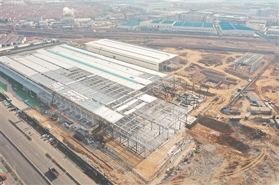记者现场看到,进度最快的办公楼已经主体封顶,它的面积不小,但与装配车间一比则“相形见绌”。装配车间是一个318米长、120米宽、近20米高的巨大建筑,单单立柱就超过400根。当下,工人们正加紧进行屋面内板、外板安装,原本的框架结构正快速变为成型的厂房。