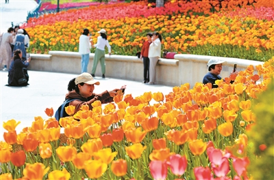 | ■在青岛植物园东南门的花坛里,成片的郁金香花开似海,吸引众多市民来此赏花。 于 滈 摄 |