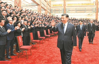 上午10时30分,习近平等来到人民大会堂金色大厅,全场响起长时间的热烈掌声。习近平等向代表们挥手致意,同大家亲切交流并合影留念。
