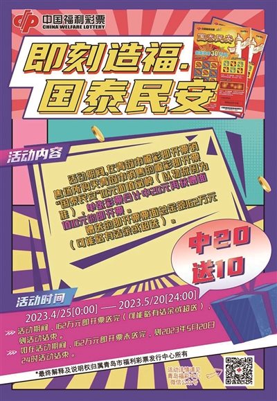 最近,针对刮刮乐“国泰民安”开展的“即刻造福·国泰民安”活动正在火热进行中。活动期间,在青岛市福彩即开票销售场所,购买福彩即开票“国泰民安”10元面值品种(以物流码为准),单张彩票合计中20元再获赠面值10元的即开票。赠送的即开票票面总金额162万元(可能略有结余或超送)。宋女士也祝愿彩民朋友们在积极参与活动的同时,都能尽享刮彩乐趣,收获福利,收获惊喜。