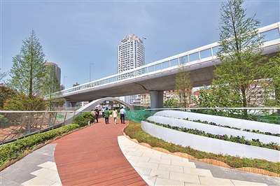 “浮岛”结合桥面及地面空间进行景观布置与绿化提升,在满足交通需要的同时,兼顾居民休憩、观览以及城市形象展示等城市功能需求,力求实现城市公共设施公益便民、活力赋能、艺术趣味等综合效益。项目建成后将提升中山路地铁站、李村路停车场、聊城路停车场及体育中心等新建公共设施通达便捷性,进一步激发南北两侧胶州路与聊城路商圈的活力与潜力,并衔接辐射到中山路北端与馆陶路南端区域。