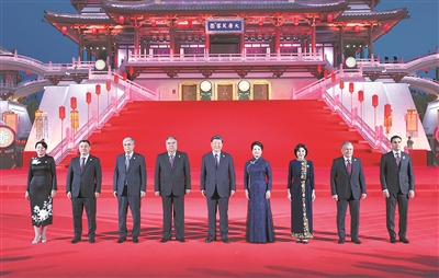 习近平夫妇在紫云楼前同贵宾亲切握手,互致问候,并合影留念。