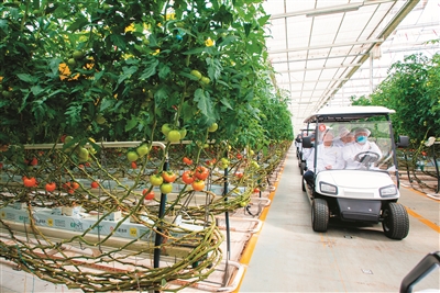 走进考察点凯盛浩丰数字农业示范园,一排排温室打造的“植物工厂”呈现在眼前。这里建有亚洲最大的智慧化育苗基地,其产品番茄畅销国内外。