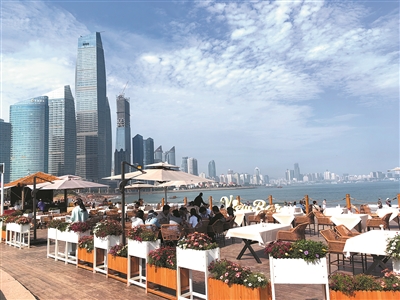 在已经变身网红打卡地的第三海水浴场,建起了400多平方米的依澜观海海景吧,既与周边景色融为一体,又可以面朝大海将海湾景致一览无余。“这里成了市民游客观赏日出、日落以及浮山湾灯光秀的最佳观景地,每天前来打卡的人络绎不绝。”第三海水浴场相关负责人告诉记者,除此之外,这里也成了附近写字楼白领们吃简餐以及洽谈的理想场所,虽然还没有到传统意义上的旅游旺季,但是每天5000多人次的客流量已经十分可观。