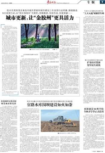 胶州市扎实推进城市更新建设。青岛市老旧街区改造和加装电梯现场会、停车设施建设现场观摩会、公园城市建设现场观摩会分别在胶州市举行;总库容2.11亿立方米的战略性水利工程官路水库项目正式启动施工;老旧小区改造成果得到《人民日报》头版头条推介,受到国家住建部、省住建厅通报表扬和推广;率先完成胶州湾海底天然气管线工程(胶州段)征迁、开工及工程建设,为保障民生注入“新热能”;落地海尔集团国内最大投资项目——百亿级的海尔卡奥斯工业互联网生态示范园,助推形成胶州市首个千亿级智能家居产业链;全省首条县域地铁加快推进,全部站点进场施工,加快迈向地铁交通时代;洋河北岭片区再次打造出阳光、和谐、文明、依法的征迁样板,完成全部19个村庄1.97万亩置换土地的签约工作,为少海片区高质量发展打开了新空间……