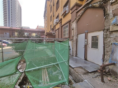 记者在现场看到,基坑南侧距离居民楼不足半米,留给居民出入的通道十分狭窄,且行道板的下方被掏空,没有任何支护。基坑北侧的围挡倒塌,基坑内长满了杂草,基坑中央盖着一块木板。木板下方是被挖断的污水管,污水溢满坑底。
