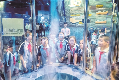 碗幕影院通过声、光、画等科技手段的配合,让观众身临其境地见证亿万年来海陆变迁的过程,感受沧海桑田的巨变;在射击游戏中,观众可以击打屏幕上出现的各类生物,从而了解海洋物种入侵的危害;进入“奋斗者”号模型,观众可以模拟驾驶这一“大国重器”,从而对水声通信、深海锂电池、浮力材料等高科技有更深入的了解;走上“影像沙滩”,观众不仅能在室内“踏浪”,还能借助投影等技术在沙滩上留下“脚印”……