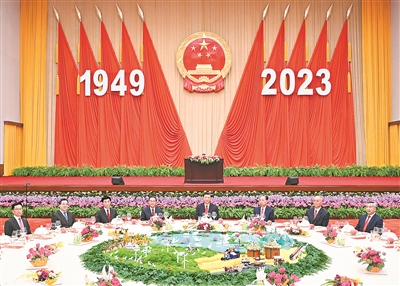 人民大会堂宴会厅华灯璀璨、鲜花绽放,洋溢着喜庆热烈的节日氛围。主席台上方高悬着庄严的国徽,“1949-2023”大字年号在鲜艳的红旗映衬下格外醒目。