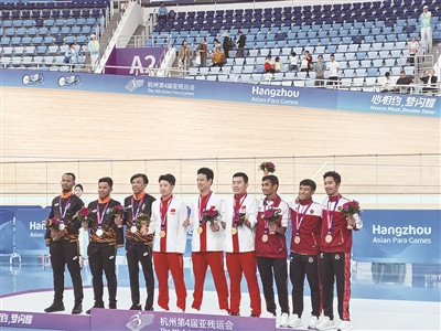本报10月23日讯 23日下午,在浙江淳安界首体育中心自行车馆举行的残疾人自行车C1—C5混合团体赛决赛中,来自青岛的残疾人选手吴国庆和队友李樟煜、赖善章、梁伟聪、谭泽强密切配合,以48.001秒获得750米混合团体竞速赛冠军并打破亚残运会纪录。这是青岛运动员在本届亚残运会上获得的首枚金牌,也是我省本届亚残运会首枚金牌。